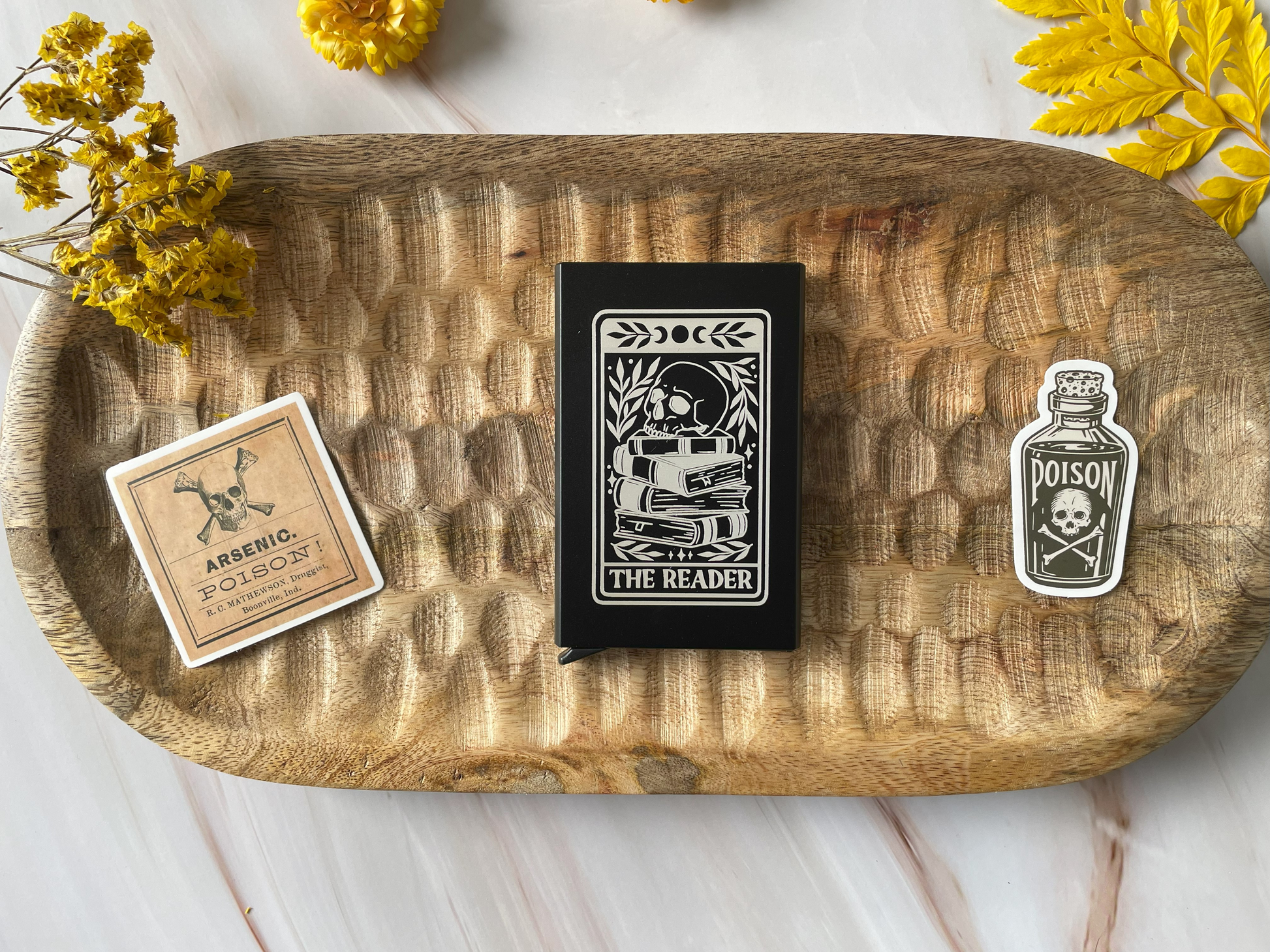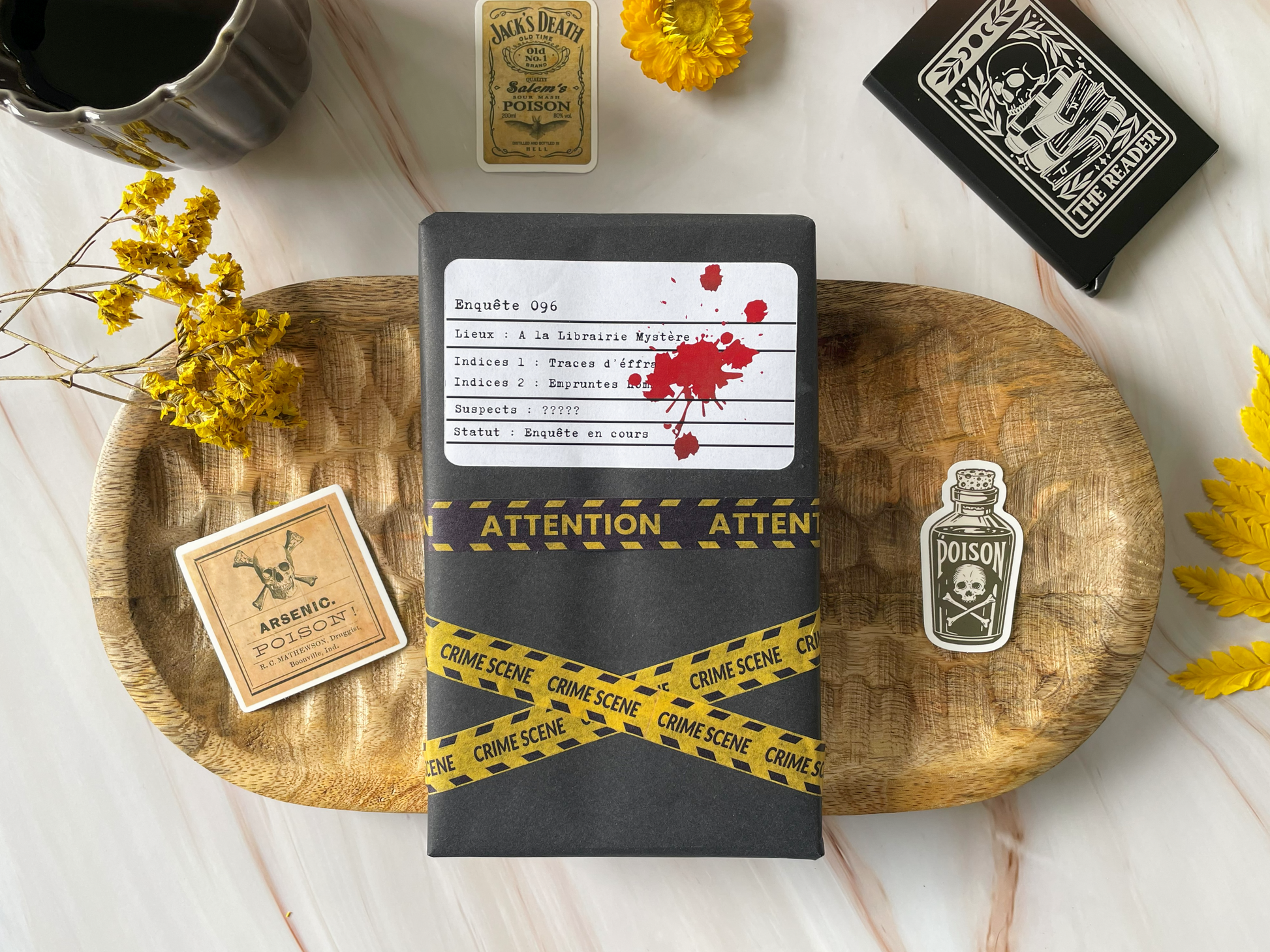🖤 Les accessoires exclusifs : Tout le nécessaire pour plonger pleinement dans l’univers de votre box avec marque-page unique, un porte-carte gravé au design carte de tarot, 4 stickers inspirés du monde du polar.